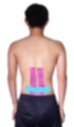 Step3找到剛剛量的「髂後上棘」,並取一格不給張力的貼上。其餘部分沿著脊椎兩旁的「束脊肌」貼去,並用手按壓撫平。